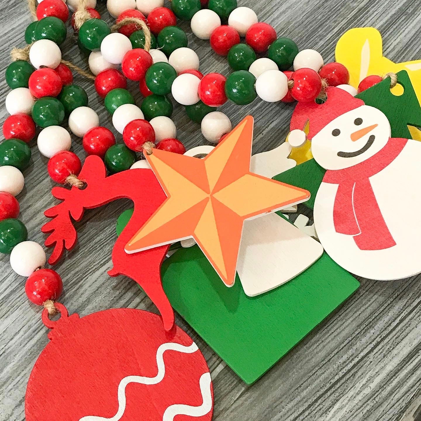 Christmas string garland wooden beads in different assortment.
